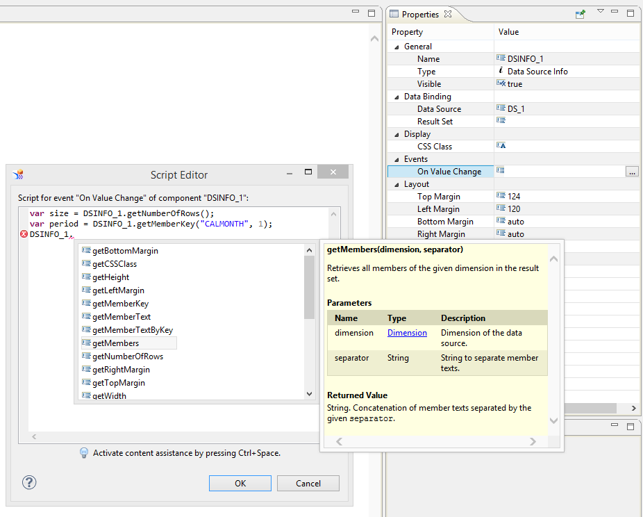 Zu beachten ist, dass für die Komponente dieselbe Einschränkung gilt wie für „normale“ SDK-Extensions: Die Ergebnismenge einer Data Source wird der Extension nur innerhalb des Javascript-Kontextes im Browser zur Verfügung gestellt. Normalerweise ist dies ideal, um eine Visualisierung im Browser zu generieren. BIAL-Methoden werden jedoch von der Design Studio-Runtime auf dem Server ausgeführt. Um die oben genannten Eigenschaften via BIAL zur Verfügung zu stellen, müssen dementsprechend Teile der Ergebnismenge von der SDK Extension wieder zurück zum Server übertragen werden, was aus Performance-Gesichtspunkten natürlich nicht ideal ist.
