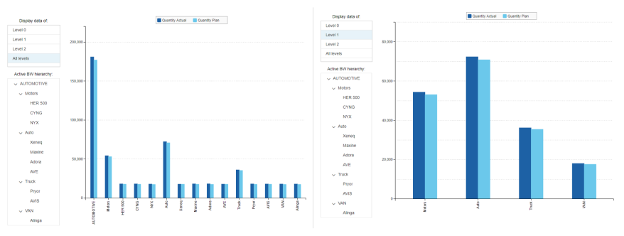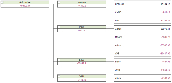 Das Add-on schlüsselt die Abweichungen zwischen den zwei Kennzahlen auf einer BW-Hierarchie-Ebene bzw. der Summenzeile in seine Einzelwerte auf. Mittels BIAL-Skript kann ein Drill-down innerhalb einer BW-Hierarchie realisiert werden, um einzelne Hierarchie-Ebenen genauer zu analysieren.