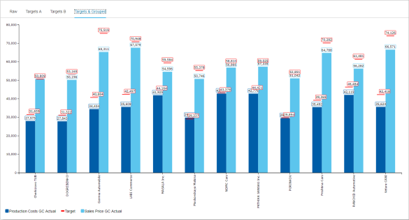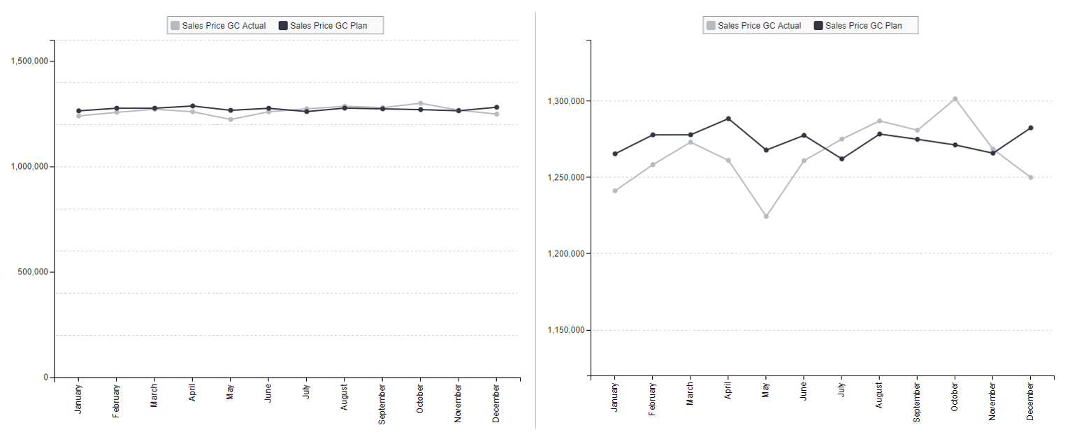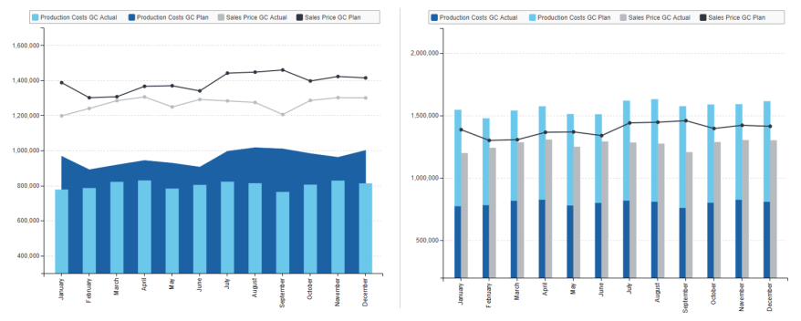 Neben der klassischen Darstellung der Kennzahlen-Abweichung in den Zwischenschritten können auch die Absolutwerte der Zwischenschritte eingeblendet werden. Verschiedene Hilfslinien verdeutlichen die Zusammenhänge zwischen den jeweiligen Werten und vereinfachen so deren Interpretation.